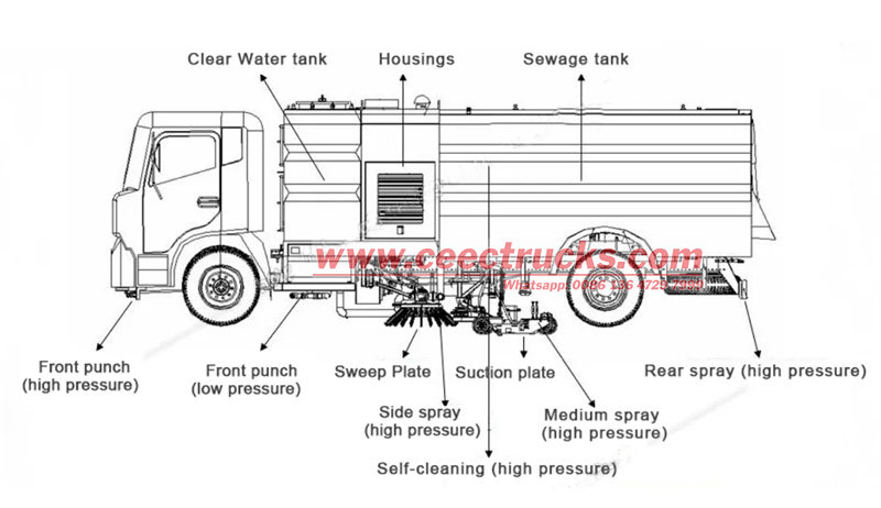 ♦ လမ်းမပေါ်တွင် သန့်ရှင်းရေးလုပ်သည့် ထရပ်ကားကိုယ်ထည်အပေါ်ပိုင်းကိရိယာတွင် လမ်းများ၊ အများသူငါရင်ပြင်များနှင့် လေဆိပ်များကဲ့သို့ ကွဲပြားသောပတ်ဝန်းကျင်နှင့် လိုက်လျောညီထွေဖြစ်အောင် လုပ်ဆောင်မှုမုဒ်များစွာပါရှိသည်။