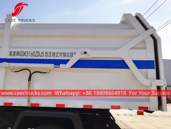 Dongfeng LHD / RHD 4*2 ကိုယ်ထည်၊ CUMMINS 210HP ဒီဇယ်အင်ဂျင်၊ 8-shift manual ဂီယာဘောက်စ်၊ ဟိုက်ဒရောလစ်နောက်တံခါးကို အသုံးပြုသည့် Dongfeng 15000litres အမှိုက်စုဆောင်းထရပ်ကား၊ ပန်းချီနှင့် လိုဂိုအားလုံးသည် လိုအပ်ချက်အပေါ် မူတည်ပါသည်။