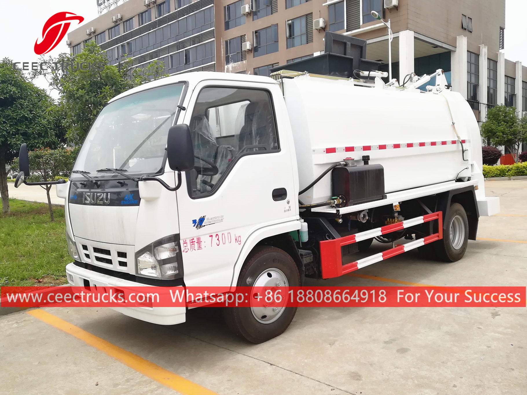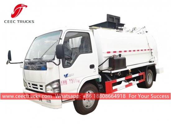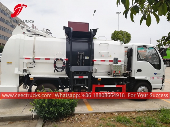 ISUZU 6cbm မီးဖိုချောင် အမှိုက် စုဆောင်းရေး ထရပ်ကား၊ ISUZU 4x2 ကိုယ်ထည်၊ manual 5-shift manual gearbox၊ ISUZU 130HP ဒီဇယ်အင်ဂျင်၊ အလိုအလျောက် ဘေးဖယ်စက်၊ ဟိုက်ဒရောလစ် အနောက်တံခါး၊ ပန်းချီနှင့် လိုဂိုများ တပ်ဆင်ထားသော လိုအပ်ချက်အပေါ် မူတည်ပါသည်။
