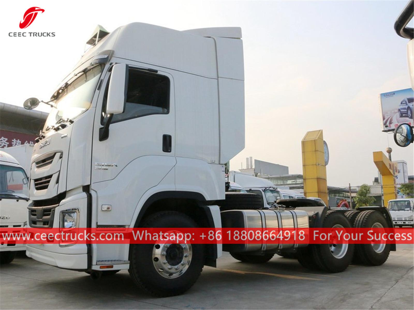 ISUZU GIGA 6x4 prime mover၊ LHD သီးသန့်၊ ဂျပန်နည်းပညာ ISUZU 380HP ဒီဇယ်အင်ဂျင်၊ ZF 16-shift manual ဂီယာအုံ၊ အမြင့်ဆုံးဆွဲအလေးချိန် 40Tons အထိ၊ ပန်းချီနှင့် လိုဂို လိုအပ်ချက်အပေါ် မူတည်ပါသည်။
