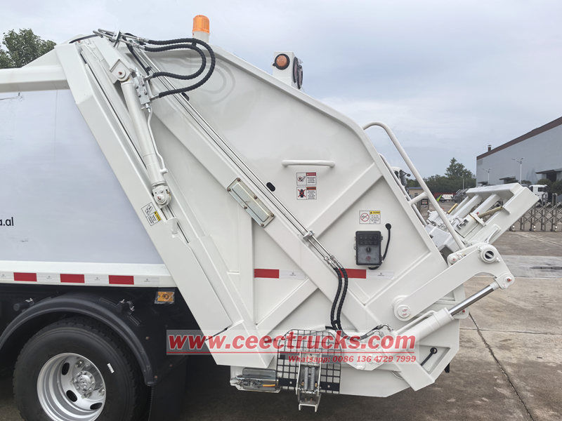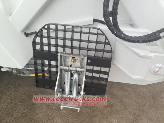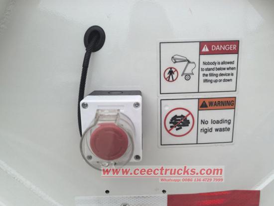 အော်ပရေတာများနှင့် စက်ပစ္စည်းများ၏ ဘေးကင်းစေရန်အတွက်၊ ယာဉ်ကို ဘေးကင်းလုံခြုံရေး အကာအကွယ် ယန္တရားများစွာဖြင့် ဒီဇိုင်းထုတ်ထားသည်။ မတော်တဆမှုများကို ကာကွယ်ရန် မည်သည့်အခြေအနေ သို့မဟုတ် အနေအထားတွင်မဆို အမှိုက်ချုံ့သည့်ကိရိယာကို ချက်ချင်းရပ်တန့်ရန် အရေးပေါ်ရပ်တန့်ရန် ခလုတ်ကို ပေးထားသည်။ ထို့အပြင်၊ lifting cylinder တွင် explosion-proof valve ပါရှိပြီး ဆီပိုက်ရုတ်တရက်ကျိုးသွားသောအခါ အန္တရာယ်မဖြစ်စေရန် filler မှ ဆင်းမလာအောင် တားဆီးပေးသည်။