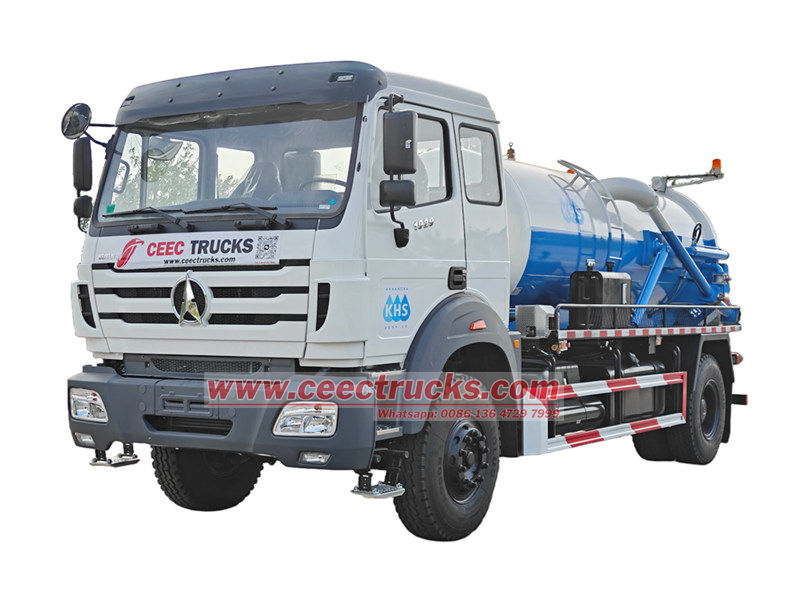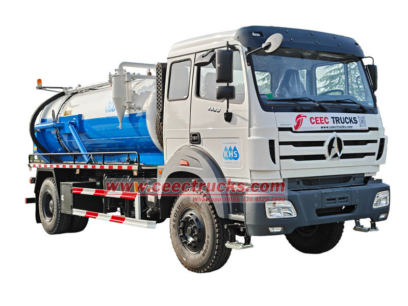 Beiben 8cbm မိလ္လာပန့်ထရပ်ကားသည် Beiben 1929 ကိုယ်ထည်၊ wheelbase 4800၊ Euro 3 ဒီဇယ်ဆီ 9.726L ထုတ်လွှတ်မှုအပေါ် အခြေခံထားပြီး မြင်းကောင်ရေ 290hp WP10.290E32 ဒီဇယ်အင်ဂျင်နှင့် FAST 9JS150A ဂီယာအုံ၊ စုစုပေါင်း တာယာ 127 လုံး၊ လည်ပတ် မော်တော်ယာဉ်တွင် 8cbm ဖုန်စုပ်ကန်တစ်ခု တပ်ဆင်ထားပြီး မြို့ပြရေမြောင်းများနှင့် စက်မှုပိုက်လိုင်းများကဲ့သို့ သောင်တူးခြင်းဆိုင်ရာ လိုအပ်ချက်များကို ဖြည့်ဆည်းပေးနိုင်သည်။