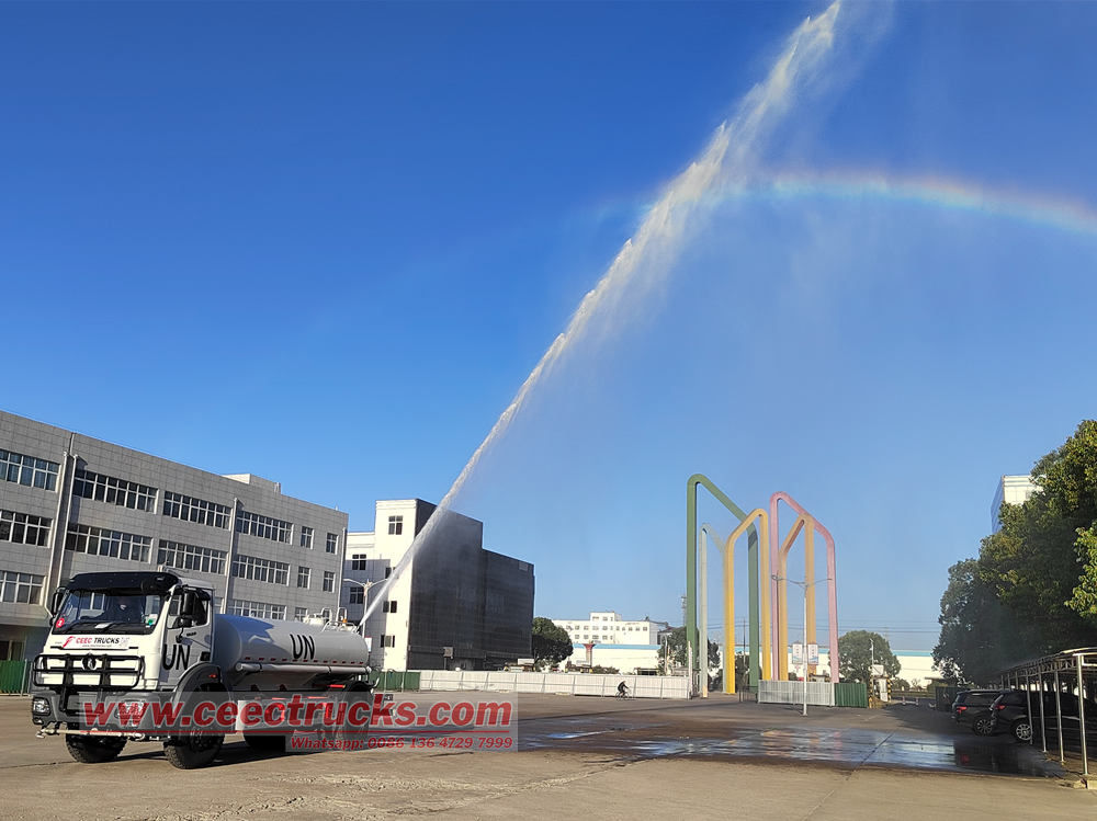 ၃။ မီးငြှိမ်းသတ်ရာတွင် အကူအညီနှင့် အရေးပေါ် စစ်ဆင်ရေးများ-Beiben off-road water bowser ထရပ်ကားတွင် 60 ~ 100 မီတာအကွာအဝေးရှိသောဖိအားမြင့်ရေအမြောက်များတပ်ဆင်ထားသည်။ မီးငြှိမ်းသတ်ခြင်းနှင့် အအေးခံခြင်း၊ အရေးပေါ်မီးထိန်းချုပ်ခြင်းအတွက် အသုံးပြုနိုင်ပြီး အများပြည်သူ အရေးပေါ်အခြေအနေများကို တုံ့ပြန်ရန်အတွက် ပိုးသတ်ဆေးများနှင့်လည်း အသုံးပြုနိုင်သည်။
