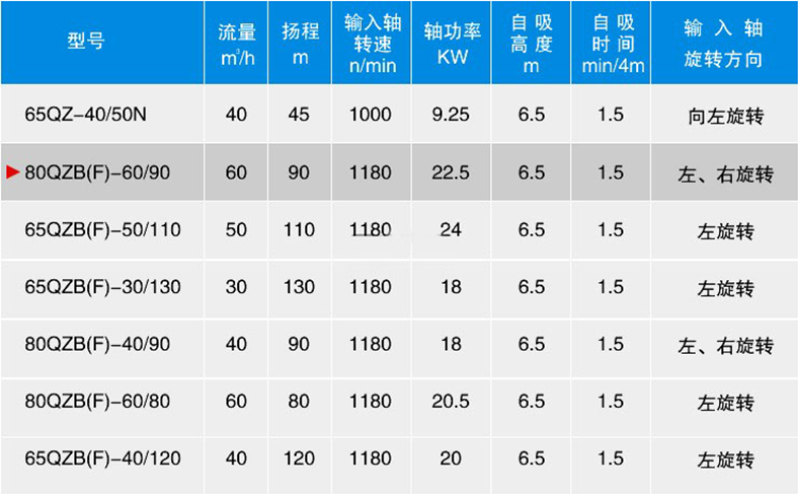 80QZF-6090S ရေစုပ်စက်သည် ရေတင်ကားများနှင့် အခြားအထူးပြုယာဉ်များတွင် အသုံးပြုရန် အထူးဒီဇိုင်းထုတ်ထားသော self-priming centrifugal စုပ်စက်တစ်ခုဖြစ်သည်။ ၎င်း၏ အဓိက ကန့်သတ်ချက်များတွင်- တစ်နာရီလျှင် ရေစီးဆင်းမှုနှုန်း 60 m³၊ ရေအနက် 90 မီတာ၊ self-priming အမြင့် 6.5 မီတာနှင့် self-priming အချိန် 1.5 မိနစ်တို့ ပါဝင်သည်။ ၎င်းကို သံမဏိဖြင့် ပြုလုပ်ထားပြီး ပြင်ပ ရောစပ် self-priming တည်ဆောက်ပုံ ပါရှိသည်။ ယာဉ်၏ ပါဝါစတင်ခြင်းဖြင့် မောင်းနှင်သောကြောင့် သန့်ရှင်းသော ရေမီဒီယာကို သယ်ယူပို့ဆောင်ရန်အတွက် သင့်လျော်သည်။