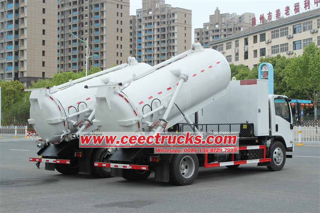 အားကောင်းသော ဖုန်စုပ်စနစ်: စွမ်းရည်မြင့် ဖုန်စုပ်ပန့်များ တပ်ဆင်ထားသော ISUZU ဖုန်စုပ်ထရပ်ကားများသည် အရည်နှင့် အညစ်အကြေးများကို တိကျစွာ ထိရောက်စွာ ဖယ်ရှားပေးပါသည်။