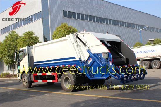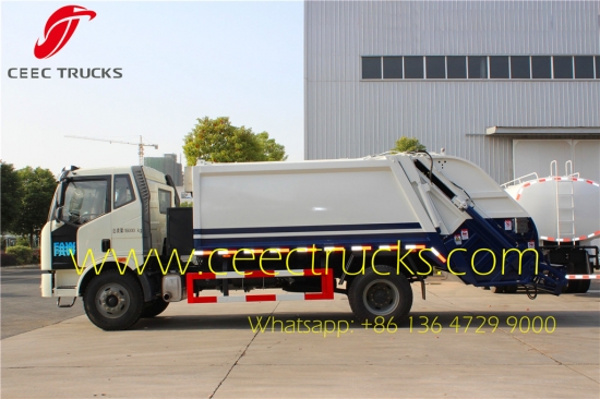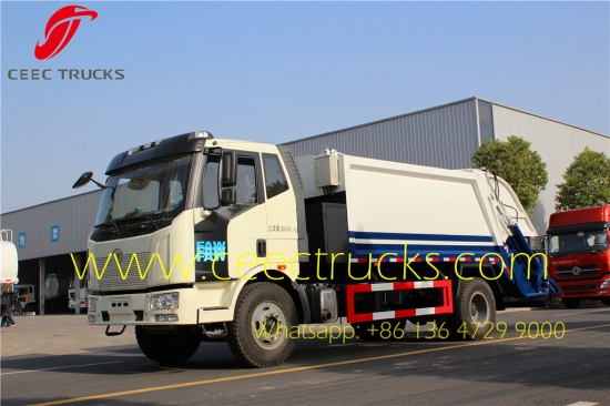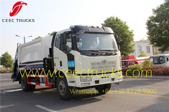 FAW အမှတ်တံဆိပ် 10 CBM အမှိုက်ကြိတ်စက်ထရပ်ကားများသည် အာဖရိက၊ 4*2 drive မော်ဒယ်၊ Euro3 ထုတ်လွှတ်မှု 165HP အင်ဂျင်၊ 6+1 ယူနစ်တာယာများ၊ ကာဗွန်သံမဏိ Q235 စွမ်းရည် 10CBM ရှိသော ကာဗွန်သံမဏိပစ္စည်းတင်သင်္ဘော
