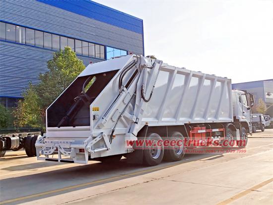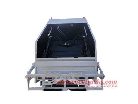 အမှိုက်စုဆောင်းခြင်း၊ ကျစ်လျစ်ခြင်းနှင့် ဖယ်ရှားခြင်းများသည် သန့်ရှင်းရေးဆိုင်ရာ လုပ်ငန်းများကို ပြီးမြောက်စေရန် ဖိသိပ်ထားသော အမှိုက်ထရပ်ကား၏ အဓိကလုပ်ငန်းစဉ်များဖြစ်သည်။ စုဆောင်းမှုအဆင့်အတွင်း ယာဉ်မောင်း၏ဘေးနှင့် နောက်တံခါးနှစ်ခုစလုံးမှ ထိန်းချုပ်ထားသည့် နောက်တပ်ဆင်ထားသောပုံး-ရုတ်သိမ်းသည့်ယန္တရားသည် 240L/660L စံအမှိုက်ပုံးကို အဖြည့်ကိရိယာအဖွင့်သို့ လွှင့်တင်သည်။ အမှိုက်သွန်ပြီးနောက်၊ လျှောပန်းကန်ပြား ကျသွားသည်၊ ခြစ်စက်သည် လှည့်ကာ အမှိုက်ထဲသို့ ထည့်ကာ အစပိုင်းတွင် သေးငယ်စေရန် ဒေါင်လိုက်ပိတ်ပြီး ခြစ်သည်။ ထို့နောက် လျှောပြားသည် တက်လာကာ ခြစ်သူက အမှိုက်များကို အမှိုက်ပုံးထဲသို့ ခြစ်သည်။