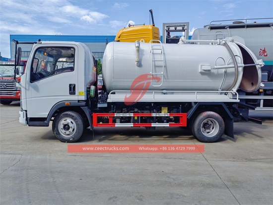 HOWO 5cbm ဖုန်စုပ်မိလ္လာစုပ်ထရပ်ကား၊ HOWO Right Hand Drive မော်ဒယ် 4x2 ကိုယ်ထည်၊ 5-shift manual gearbox၊CUMMINS141 ဒီဇယ်အင်ဂျင်၊ တရုတ်နာမည်ကြီးတံဆိပ် ဖုန်စုပ်စက်၊ ပန်းချီနှင့် လိုဂိုများသည် လိုအပ်ချက်အပေါ် မူတည်သည်။