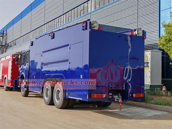 HOWO 6x4 ပေါက်ကွဲမှုဒဏ်ခံနိုင်သော ရေအမြောက်ထရပ်ကားအား HOWO HW76 နှစ်တန်းတက္ကစီကိုယ်ထည်ကိုအခြေခံ၍ WP10H400E60 အင်ဂျင်နှင့် HW15710 ဂီယာဘောက်စ် တပ်ဆင်ထားသည့် WP10H400E60 ဂီယာအုံတပ်ဆင်ထားသော HOWO 6x4 နှစ်ထပ်တက္ကစီကိုယ်ထည်ကို ပြုပြင်ထားသည်။ ယာဉ်တွင် ပေါက်ကွဲဒဏ်ခံသေတ္တာတစ်ခု၊ ထိပ်တွင် ပင်မသေနတ်တစ်လက်နှင့် ဦးခေါင်းပေါ်ရှိ ရှေ့ရေအရန်သေနတ်တစ်လက်တို့ တပ်ဆင်ထားပြီး၊ ဘက်စုံ၊ ကြီးမားသော စီးဆင်းမှုနှင့် ခရီးဝေး အဓိကရုဏ်းများကို ထိန်းချုပ်နိုင်မည်ဖြစ်သည်။ တက္ကစီနှစ်တန်း၊ ခရီးသည် ၆ ယောက်၊ ရေတင်သင်္ဘော: 12000L၊ Foam tanker: 100L၊ Dye tanker: 100L၊ Pepper water tank: 100L၊ CB10/60 fire pump တပ်ဆင်ထားသော၊ ယာဉ်၏အရှေ့ဘက်တွင် အဓိကရုဏ်းဒဏ်ခံနိုင်သော သံမဏိပြားနှင့် အားကောင်းသော ဟိုက်ဒရောလစ်အတားအဆီးရှင်းလင်းရေးစတီးရွိုက်ဂေါ်ပြားများ တပ်ဆင်ထားပါသည်။ မီးချောင်းများနှင့် ပြတင်းပေါက်မှန်များကို stainless steel mesh ဖြင့် ကာကွယ်ထားပါသည်။