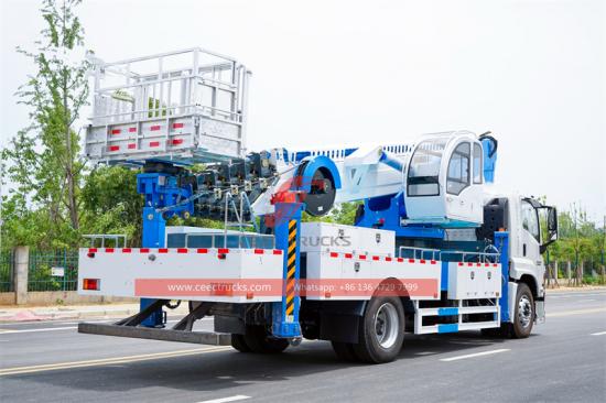 7-section fourteen-sided synchronous telescopic armISUZU FTR 45m ဝေဟင်ပစ်ပလပ်ဖောင်းသည် အလွန်ကောင်းမွန်သော နည်းပညာပိုင်းဆိုင်ရာ စွမ်းဆောင်ရည်နှင့် ဘေးကင်းရေး ဒီဇိုင်းကို ပေါင်းစပ်ထားသည့် ပရော်ဖက်ရှင်နယ် အင်ဂျင်နီယာ အထူးထရပ်ကား ဖြစ်ပါသည်။ ISUZU New GIGA FTR ကိုယ်ထည်ကိုအခြေခံ၍ ထရပ်ကားသည် မြင်းကောင်ရေ 205 ကောင်အားနှင့် အမြင့်ဆုံးထွက်ရှိနိုင်သော 4HK1-TC60 အင်ဂျင်ကို တပ်ဆင်ထားပြီး စုစုပေါင်းယာဉ်ထုထည်မှာ 18,000 ကီလိုဂရမ်ဖြစ်သည်။ Isuzu FTR ဝေဟင်ပလပ်ဖောင်းထရပ်ကားသည် အမြင့်ဆုံးလုပ်ငန်းခွင်အမြင့် 45 မီတာ၊ မြေပြင်အထက် 27 မီတာမြင့်သော ပလပ်ဖောင်းအမြင့် 7 မီတာ နှင့် တည်ငြိမ်မှုကိုသေချာစေရန် ဟိုက်ဒရောလစ်စတိတ်ချိန်ခွင်လျှာစနစ်ပါရှိသည်။