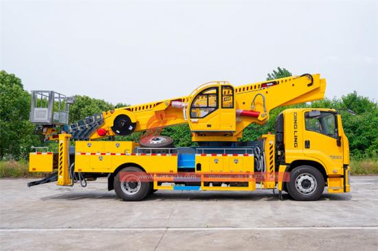 7-section fourteen-sided synchronous telescopic armISUZU FTR 45m ဝေဟင်ပစ်ပလပ်ဖောင်းသည် အလွန်ကောင်းမွန်သော နည်းပညာပိုင်းဆိုင်ရာ စွမ်းဆောင်ရည်နှင့် ဘေးကင်းရေး ဒီဇိုင်းကို ပေါင်းစပ်ထားသည့် ပရော်ဖက်ရှင်နယ် အင်ဂျင်နီယာ အထူးထရပ်ကား ဖြစ်ပါသည်။ ISUZU New GIGA FTR ကိုယ်ထည်ကိုအခြေခံ၍ ထရပ်ကားသည် မြင်းကောင်ရေ 205 ကောင်အားနှင့် အမြင့်ဆုံးထွက်ရှိနိုင်သော 4HK1-TC60 အင်ဂျင်ကို တပ်ဆင်ထားပြီး စုစုပေါင်းယာဉ်ထုထည်မှာ 18,000 ကီလိုဂရမ်ဖြစ်သည်။ Isuzu FTR ဝေဟင်ပလပ်ဖောင်းထရပ်ကားသည် အမြင့်ဆုံးလုပ်ငန်းခွင်အမြင့် 45 မီတာ၊ မြေပြင်အထက် 27 မီတာမြင့်သော ပလပ်ဖောင်းအမြင့် 7 မီတာ နှင့် တည်ငြိမ်မှုကိုသေချာစေရန် ဟိုက်ဒရောလစ်စတိတ်ချိန်ခွင်လျှာစနစ်ပါရှိသည်။