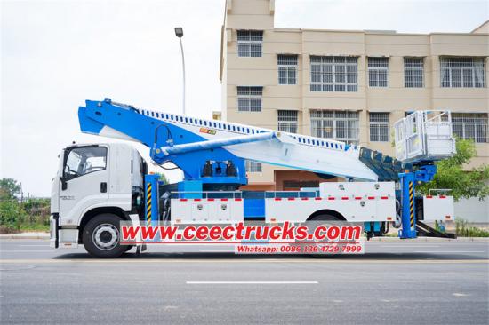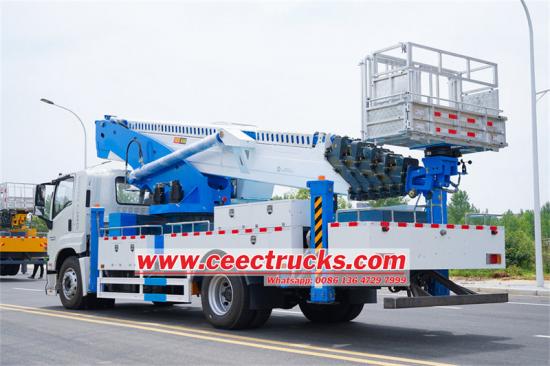 ISUZU FTR 45m Bucket Lift Truck သည် ISUZU FTR ကိုယ်ထည်ကို အခြေခံ၍ ဝေဟင်မှ အလုပ်လုပ်သော ပလပ်ဖောင်းတစ်ခုဖြစ်သည်။ ၎င်းတွင် ISUZU GIGA 4X VC61 cabin တပ်ဆင်ထားပြီး အော်ပရေတာအတွက် ကျယ်ဝန်းပြီး သက်တောင့်သက်သာရှိသော လုပ်ငန်းခွင်ပတ်ဝန်းကျင်ကို ပေးဆောင်သည်။ ယာဉ်သည် ကျယ်ပြန့်သော လုပ်ငန်းအကွာအဝေးဖြင့် လျင်မြန်ပြီး လွယ်ကူသော လည်ပတ်မှုကို သေချာစေမည့် synchronous telescoping နည်းပညာဖြင့် ခုနစ်ပိုင်း ဆဋ္ဌဂံ တယ်လီစကုပ်ကို အသုံးပြုထားသည်။ ထို့အပြင် ၎င်း၏ ရှေ့ V နှင့် အနောက် V ပုံသဏ္ဍာန် အပိုင်းသုံးပိုင်း အထွက်များ ဒီဇိုင်းသည် ရှုပ်ထွေးသော နယ်မြေအမျိုးမျိုးတွင် တည်ငြိမ်သော လုပ်ဆောင်ချက်ကို သေချာစေသည်။ အလုပ်ပလပ်ဖောင်းကို အလွယ်တကူဝင်ရောက်နိုင်စေရန်အတွက် အနောက်ဘက်တွင် နေရာချထားပြီး စတီးလ်စတီးလ်တောင်းတွင် အလေးချိန် 200 ကီလိုဂရမ်ရှိပြီး ကွဲပြားသော ဝေဟင်လုပ်ငန်းလိုအပ်ချက်များနှင့် ကိုက်ညီပါသည်။