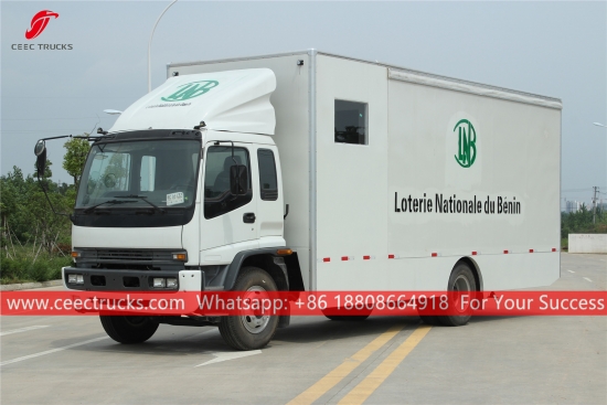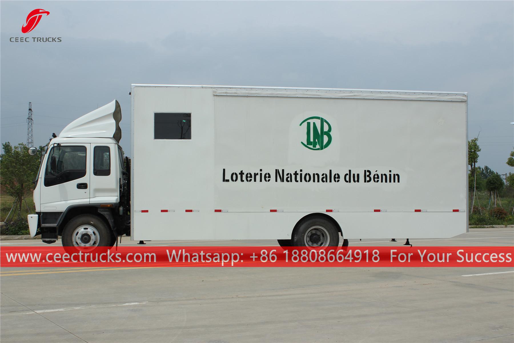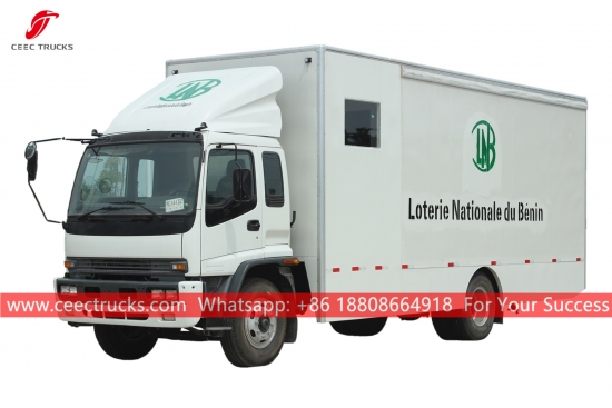 ISUZU မိုဘိုင်းစင်မြင့်ရှိုးထရပ်ကား၊ ISUZU FTR ကိုယ်ထည်၊ MLD 6-shift manual ဂီယာအုံ၊ ISUZU 205HP ဒီဇယ်အင်ဂျင်၊ ဗန်ကိုယ်ထည်အတိုင်းအတာ၊ စိတ်ကြိုက်ရွေးချယ်နိုင်သည်၊ ပန်းချီနှင့် လိုဂိုများသည် လိုအပ်ချက်အပေါ် မူတည်ပါသည်။