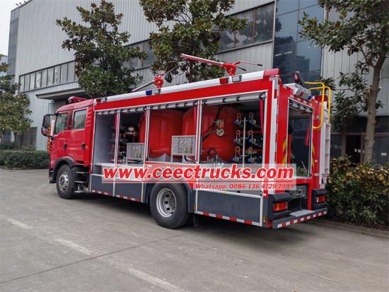 မီးသတ်ပန့်ကို PTO ဖြင့် မောင်းနှင်ထားပြီး ဖိအားအကွာအဝေး 1.6-2.5 MPa နှင့် စီးဆင်းမှုနှုန်း 80-120 kg/s ဖြစ်သည်။ မီးသတ်ပိုက်သည် 60-100 kg/s နှင့် အကွာအဝေး 40-60 မီတာ အကွာအဝေးရှိပြီး အမျိုးမျိုးသော မီးဘေးအန္တရာယ်ကို ထိထိရောက်ရောက် ကိုင်တွယ်ဖြေရှင်းနိုင်ပါသည်။ မီးသတ်ဆေးခြောက်မှုန့် နိုက်ထရိုဂျင်ထရပ်ကားတွင် စံမီးငြှိမ်းသတ်ရေးနှင့် ကယ်ဆယ်ရေးကိရိယာများ အစုံအလင်ပါရှိသည့်အပြင် ပေါက်တူးများ၊ ထန်းတက်များ၊ ပုဆိန်များနှင့် ဖြတ်တောက်သည့်ကိရိယာများ စသည်တို့လည်း တပ်ဆင်ထားပါသည်။
