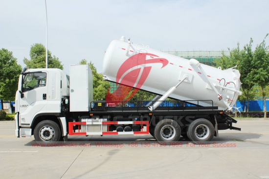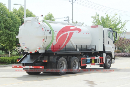 ISUZU GIGA 12000 Litres ဖုန်စုပ်တိုင်ကီ ထရပ်ကား တင်ပို့ရောင်းချပါသည်။မြန်မာ၊ ISUZU 6UZ1 model 350HP ဒီဇယ်အင်ဂျင်၊ FAST 12-shift manual gearbox၊ high strength steel material tanker can be up to 12 cbm, Optional ပြည်တွင်း WEILONG ဖုန်စုပ်ပန့်နှင့် MORO / JUROP / BP ဖုန်စုပ်ပန့်၊ hydraulic lifting device for waste discharge, painting and logos များကို တောင်းခံမှုအပေါ် မူတည်ပါသည်။