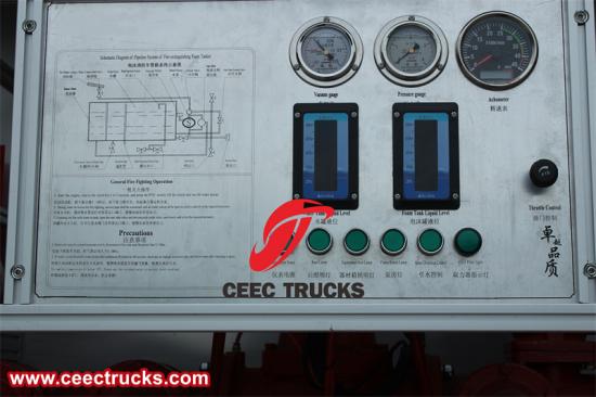 Isuzu GIGA 8x4 ခြောက်သွေ့သော အမှုန့်ရေမြှုပ်မီးသတ်ထရပ်တွင် အော်ပရေတာအား လိုအပ်သော အချက်အလက်နှင့် ထိန်းချုပ်မှုများအားလုံးကို ပံ့ပိုးပေးရန် ဒီဇိုင်းထုတ်ထားသော ပြည့်စုံပြီး အသုံးပြုရလွယ်ကူသော ထိန်းချုပ် panel တစ်ခုပါရှိသည်။