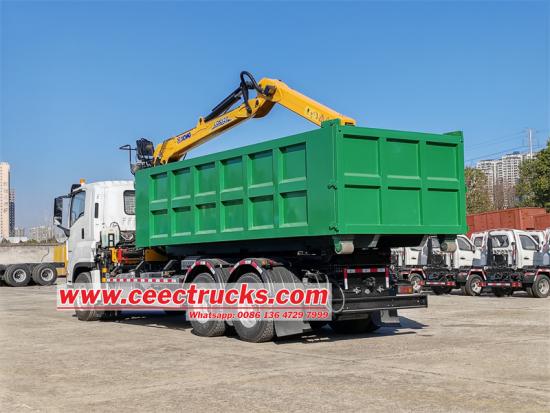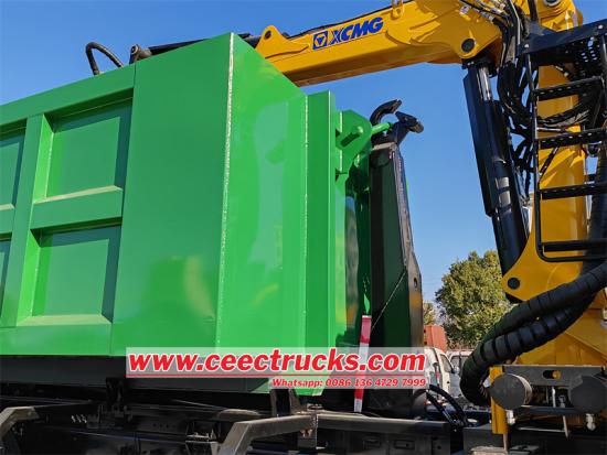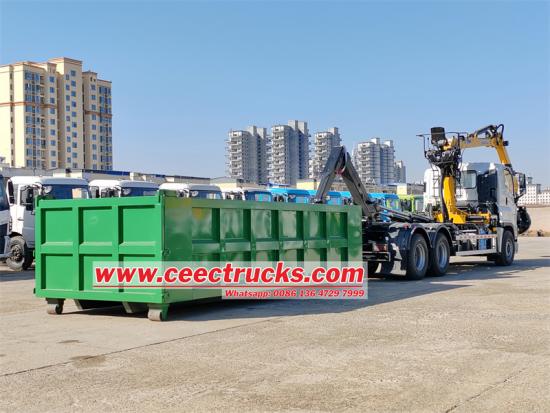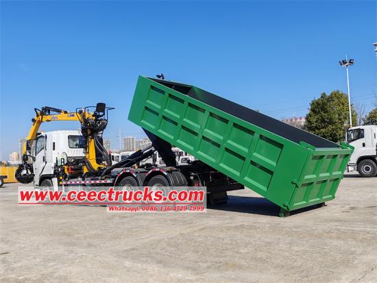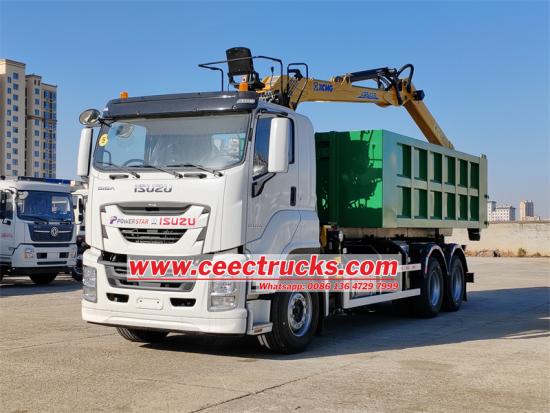 Isuzu heavy duty hook lift truck သည် ကွန်တိန်နာပါရှိသော Isuzu hook arm dump ထရပ်ကားဖြစ်ပြီး လေးလံသောကုန်ပစ္စည်းများကို ဖမ်းယူသယ်ဆောင်ရာတွင်အသုံးပြုသည့် ခေါက်လက်မောင်းရိန်းပါသော Isuzu hook arm dump truck ဖြစ်ပါသည်။ ကရိန်း၏အမြီးသည် ကျိုးပဲ့နေသော သံမဏိဓားကို ဆွဲကိုင်ထားသည်။ ကရိန်းသည် XCMG LQS120 loader ကရိန်းဖြစ်ပြီး အမြင့်ဆုံး 18 တန် အလေးချိန်၊ အများဆုံး lifting moment 12tâ–ªm ဖြစ်သည်။ ယာဉ်အား 6UZ1-TCG61 380HP အင်ဂျင်၊ FAST 12-speed ဂီယာဘောက်စ် တပ်ဆင်ထားသည့် Isuzu VC61 6X4 ကိုယ်ထည်တွင် ပြုပြင်မွမ်းမံထားပြီး ဘက် ၆ ဘက်နှင့် အောက်ခြေ ၈ ခုပါရှိသည်။