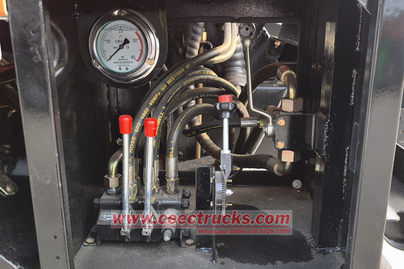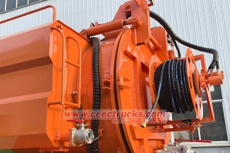 ယာဉ်တွင် သန့်စင်သောရေအား 16-240 MPa အထိ ဖိအားပေးနိုင်ရန် ဖိအားမြင့်ရေစုပ်စက်တစ်ခု တပ်ဆင်ထားပြီး၊ အနည်များ၊ သစ်ပင်အမြစ်များ၊ ပိုက်လိုင်း၏ အတွင်းနံရံရှိ ကွန်ကရစ်တုံးများကို လည်ပတ်နေသော နော်ဇယ်ဖြင့် ဖြတ်တောက်ကာ ပြတ်တောက်သွားစေသည်။ တစ်ချိန်တည်းမှာပင်၊ ဖုန်စုပ်ပန့်ကို မိလ္လာစုပ်ပိုက်မှတဆင့် တိုင်ကီအတွင်းပိုင်းရှိ အမှိုက်များနှင့် မိလ္လာများကို စုပ်ယူရန်အတွက် တိုင်ကီကိုယ်ထည်အတွင်းရှိ အနုတ်လက္ခဏာဖိအားကို ဖန်တီးရန် အသုံးပြုသည်။ အော်ပရေတာသည် ရေတွင်းသို့မဆင်းဘဲ နက်ရှိုင်းသော ပိုက်လိုင်းသောင်တူးခြင်းကို အပြီးသတ်နိုင်စေရန်အတွက် လည်ပတ်မှုတစ်လျှောက်လုံးတွင် ဖိအားမြင့်ပိုက်၏ တိုးချဲ့မှုနှင့် ကျုံ့မှုကို ထိန်းချုပ်ရန်အတွက် ဟိုက်ဒရောလစ်ဆွဲကြိုးကို အသုံးပြုသည်။