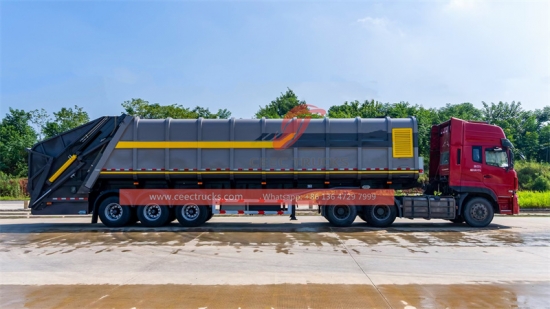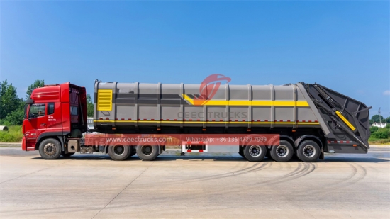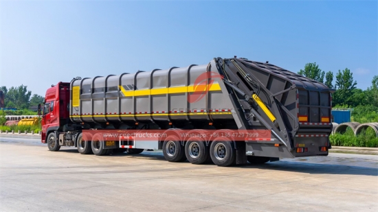 Rear Load 45CBM Garbage compactor semi trailer (ဟုလည်း ခေါ်သည်။ အမှိုက်ချုံ့semitrailer၊ အမှိုက်ကြိတ်စက်semitrailer၊ back load အမှိုက်နောက်တွဲ၊ အမှိုက်ကြိတ်စက်semitrailer၊rear loader ပါ။semitrailer၊ အမှိုက်နောက်တွဲ) အစိုင်အခဲ စွန့်ပစ်ပစ္စည်းများ စုဆောင်းခြင်း၊ ကြိတ်ခွဲခြင်းနှင့် သယ်ယူရာတွင် အသုံးပြုသည့် နောက်တွဲယာဉ် အမျိုးအစားတစ်ခု ဖြစ်သည်။ အမှိုက်ကြိတ်ခွဲသည့် တစ်ပိုင်းတွဲများသည် အမှိုက်စီမံခန့်ခွဲမှုစနစ်များတွင် အရေးပါသော ကိရိယာတစ်ခုဖြစ်ပြီး ထိရောက်စွာ စုဆောင်းခြင်း၊ ကြိတ်ခွဲခြင်းနှင့် စွန့်ပစ်ပစ္စည်းများကို သယ်ယူပို့ ဆောင်ရာတွင် အရေးကြီးသော ကိရိယာတစ်ခုဖြစ်သည်။ ကြီးမားသောစွမ်းရည် 45CBM အမှိုက်ကြိတ်စက်တစ်ပိုင်းတွဲများသည် အမှိုက်ထုထည်ကို လျှော့ချနိုင်ပြီး သယ်ယူပို့ဆောင်ရေးကို ပိုမိုကောင်းမွန်စေကာ ၎င်းတို့သည် ပိုမိုသန့်ရှင်းပြီး ရေရှည်တည်တံ့သော ပတ်ဝန်းကျင်ကို အထောက်အကူပြုပါသည်။