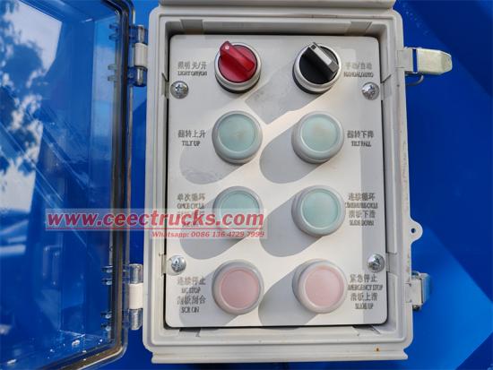 ကျောဘက်တွင် ပုံမှန် 200L/240L bins များနှင့် လိုက်ဖက်သော ဟိုက်ဒရောလစ်ပုံး lifter တပ်ဆင်ထားသည်။ အီလက်ထရွန်းနစ်-ဟိုက်ဒရောလစ်စနစ်သည် အလိုအလျောက်ဆုပ်ကိုင်ခြင်း၊ ရုတ်သိမ်းခြင်းနှင့် စွန့်ပစ်ခြင်းတို့ကို ≤45 စက္ကန့်အတွင်း ပြီးမြောက်စေပါသည်။ ယိုဖိတ်မှုအကာအရံသည် အမှိုက်များ ပြန့်ကျဲမှုကို လျော့နည်းစေသည်။